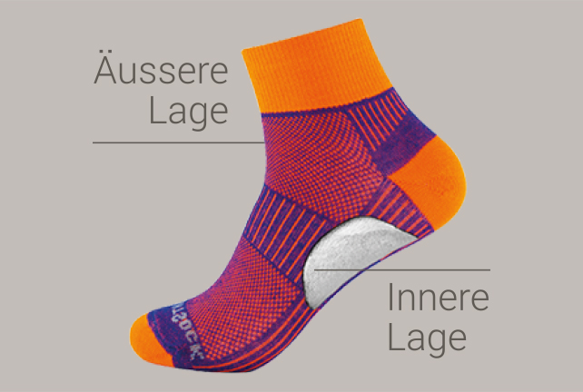 Die innere und äussere Lage der WRIGHTSOCK sind an drei Stellen miteinander verbunden und so angelegt, dass sie sich entgegengesetzt zueinander bewegen können. Dadurch wird die Reibung aufgefangen.